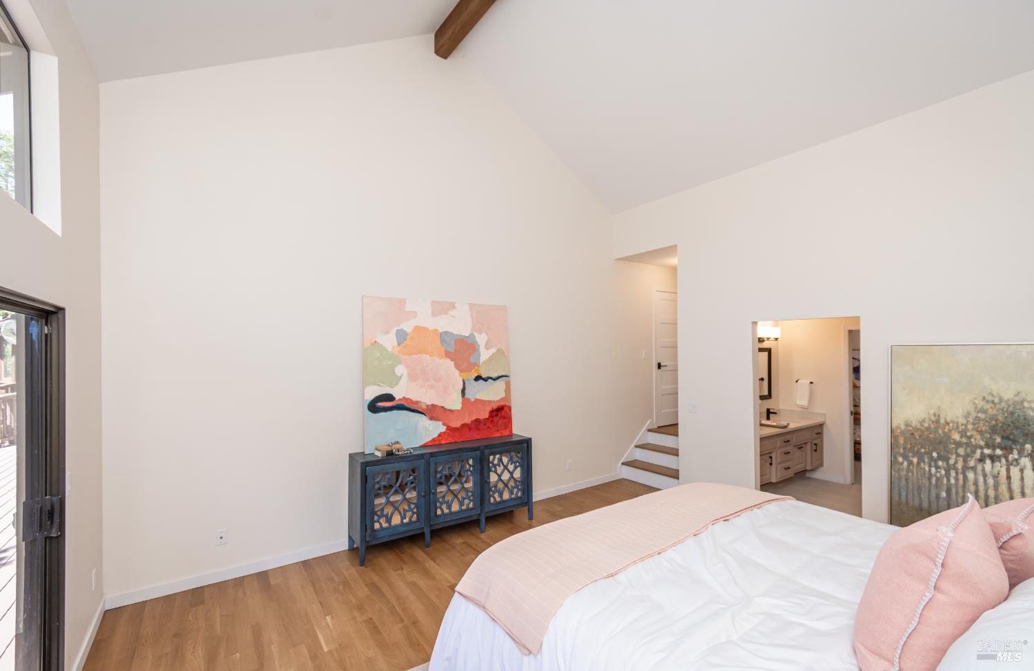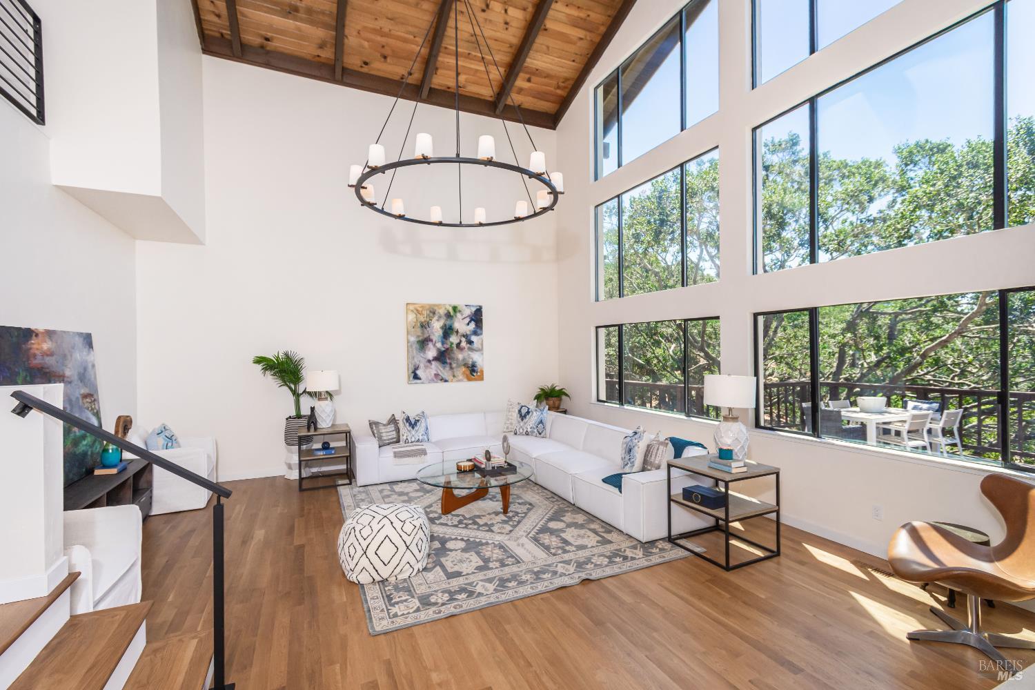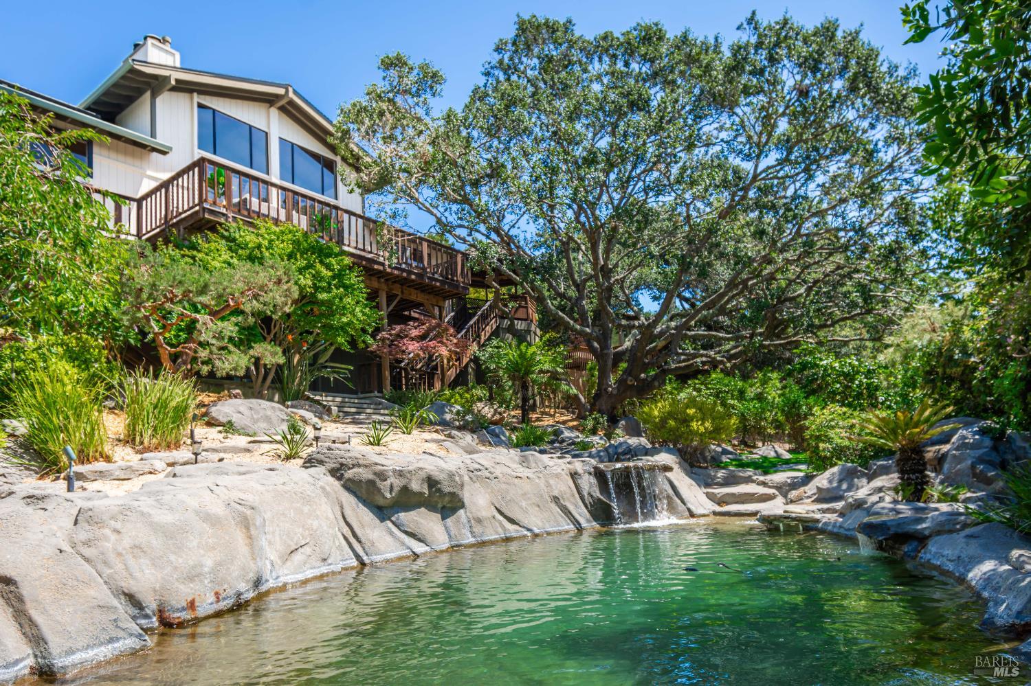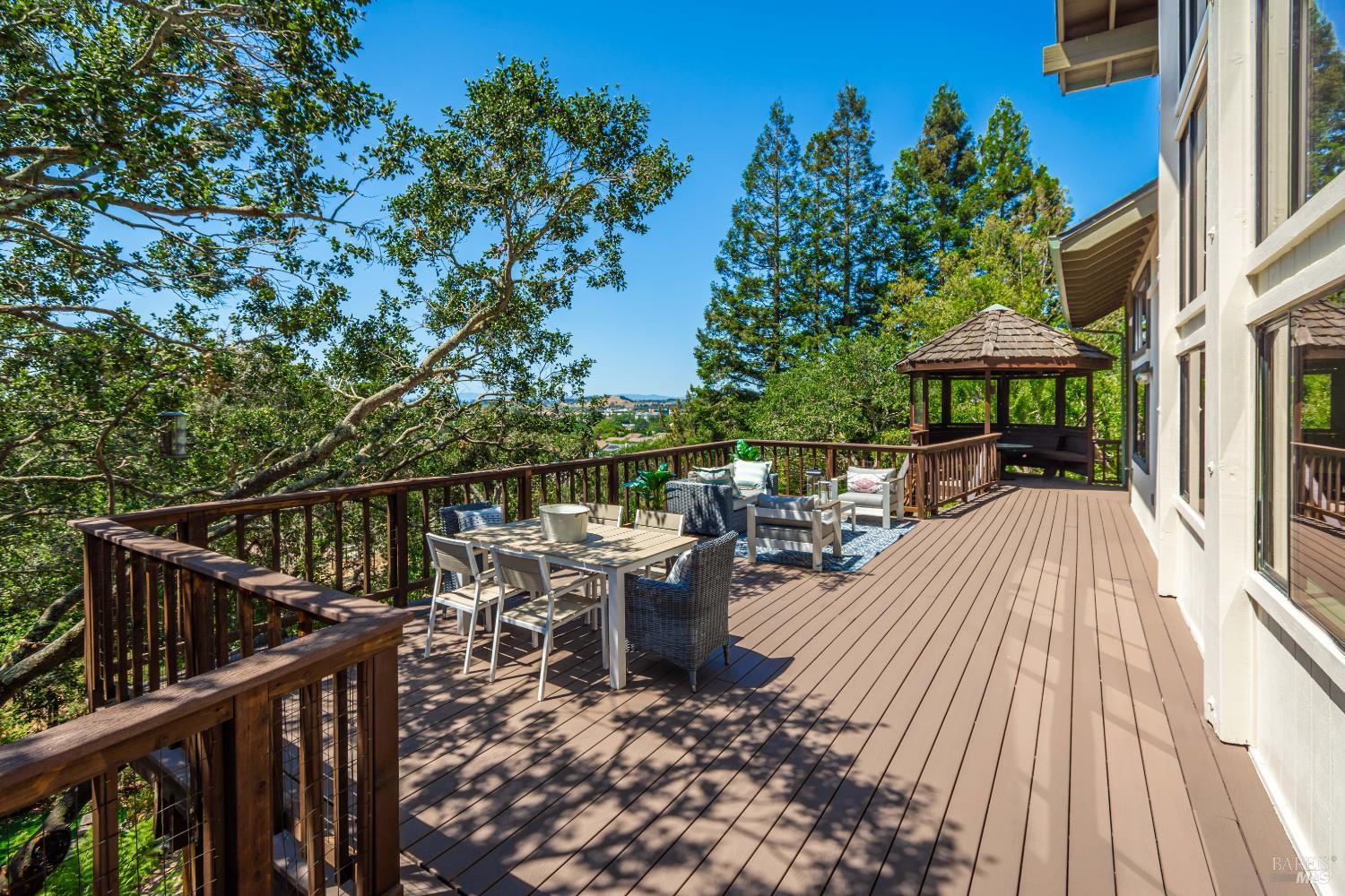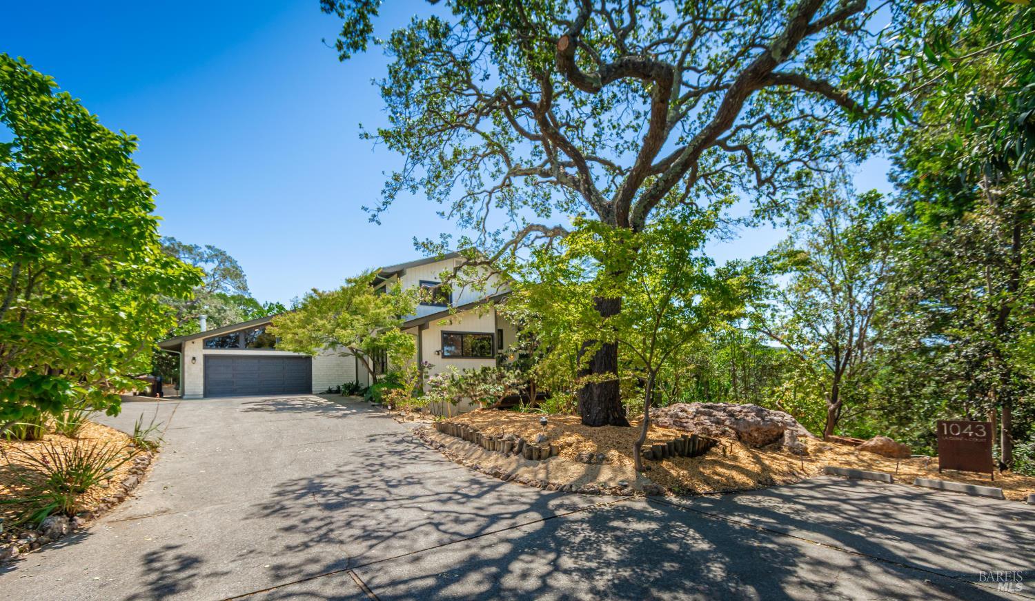 Architecturally distinctive and custom-built, this 4BD/3.5BA Napa retreat balances design, privacy, and sustainability on a .43-acre south-facing parcel set along a private drive, offering expansive views of Napa Valley, Mt. Tamalpais, and San Pablo Bay. Filled with natural light, the home features high ceilings, renovated oak floors, smooth-coat walls, fresh interior paint, refreshed bathrooms, a newer roof, and an updated HVAC system. The chef's kitchen offers stone countertops, custom cabinetry, gas range, stainless appliances, and garden-view windows, and opens to a formal dining room with wet barideal for entertaining. The main-level primary suite includes a spa-style bath with soaking tub, walk-in shower, and deck access. Upstairs are two bedrooms & a reading loft connected by architectural stairways. Outdoor living includes mature landscaping, private patio areas, a freeform pool with waterfalls, & a separate guest unit. Additional highlights include a two-way gas fireplace, owned solar with Tesla battery & charger, and an oversized two-car garage with fireplace plus guest parking. Quietly tucked in nature, yet minutes to Downtown Napa & the Oxbow Public Market.