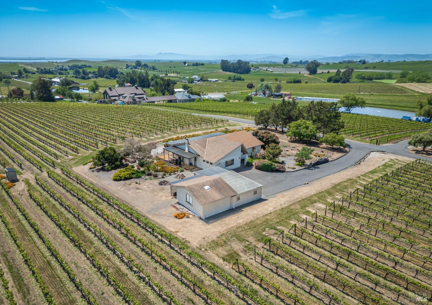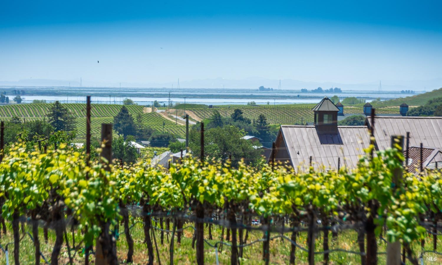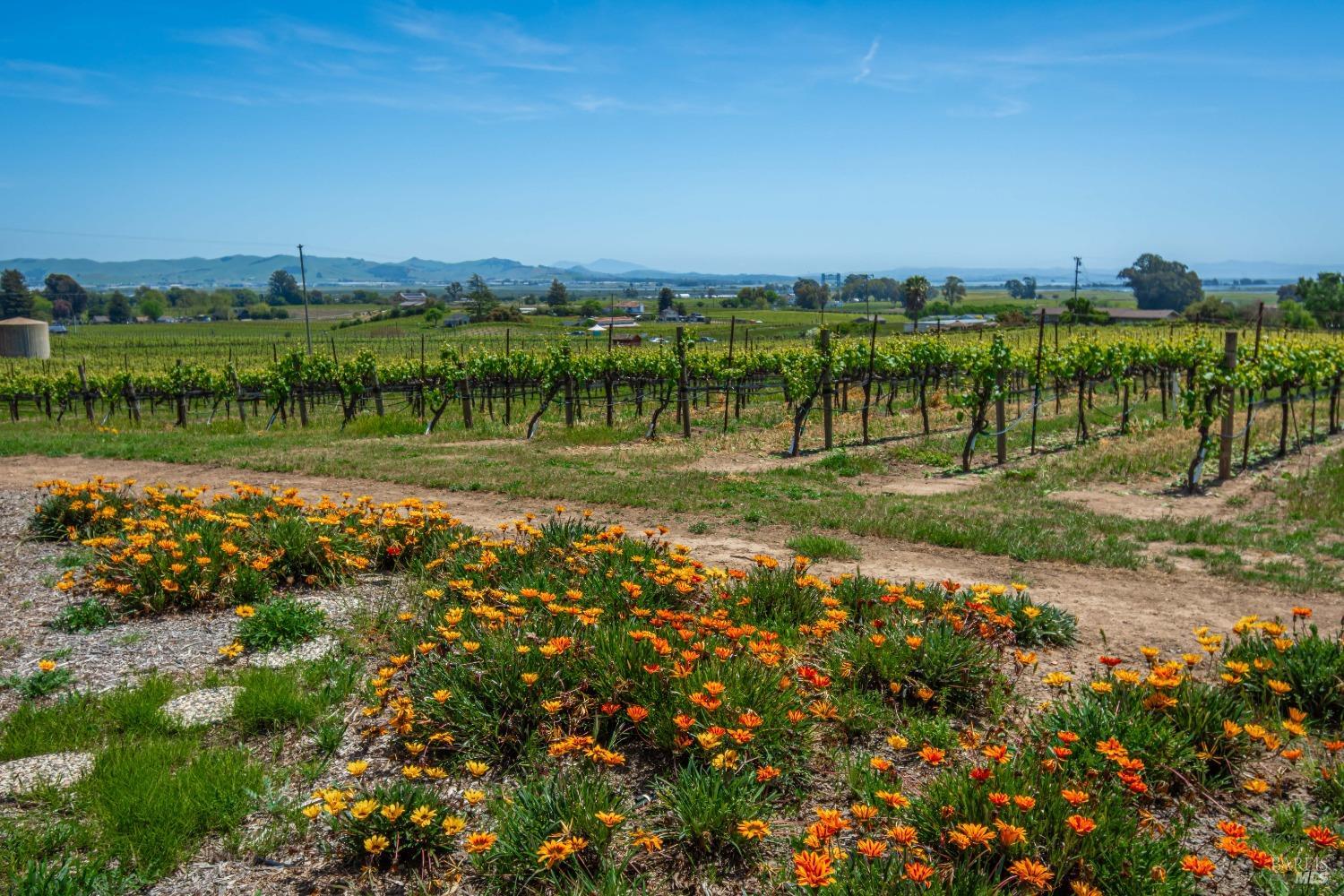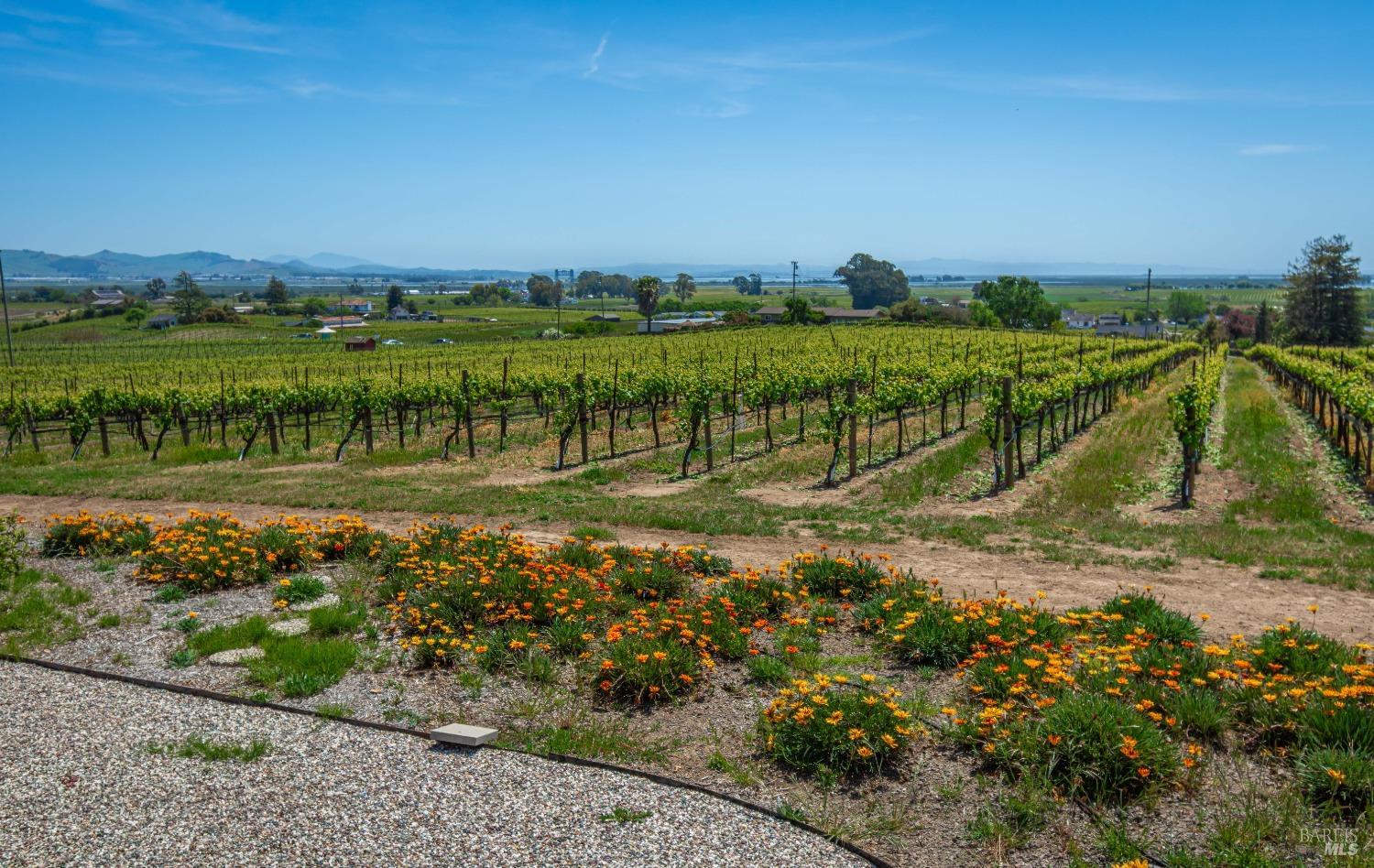 Carneros Vineyard Estate with Iconic Views 3 Bed | 2 Bath | 2,116 SF | 1 LVL |10 Acres | Carneros AVA A rare 10-acre vineyard estate perched on a private knoll in Napa's Carneros region, offering panoramic 360 viewsfrom vineyard-covered valleys to Mt. Tamalpais, Mt. Diablo, & the Bay. 8.5 acres are planted in premium Pinot Noir, currently used in a renowned sparkling wine program. The single-level 3-bedroom home is filled with natural light & framed by windows that capture breathtaking scenery from every room. Enjoy your morning coffee or evening wine from the expansive south-facing deck as hot air balloons drift by & the light dances over the vines. This peaceful & private setting is just minutes from top wineries, the Napa River, fine dining, & Sonoma access. A rare opportunity to combine vineyard investment with unmatched serenity and iconic wine country living. Detached garage, gardens, SF is just under 50 miles away