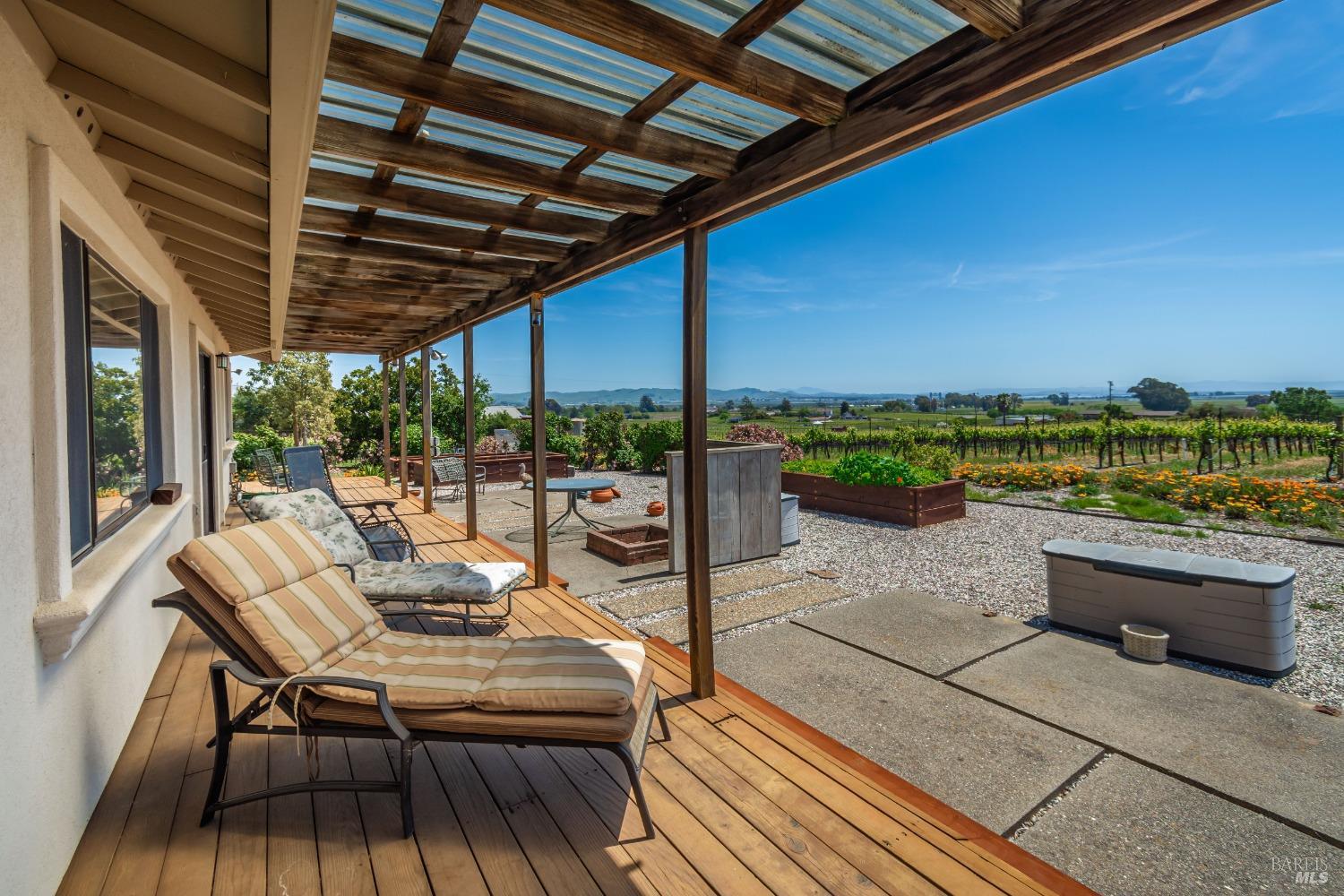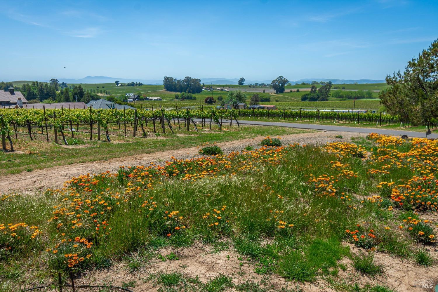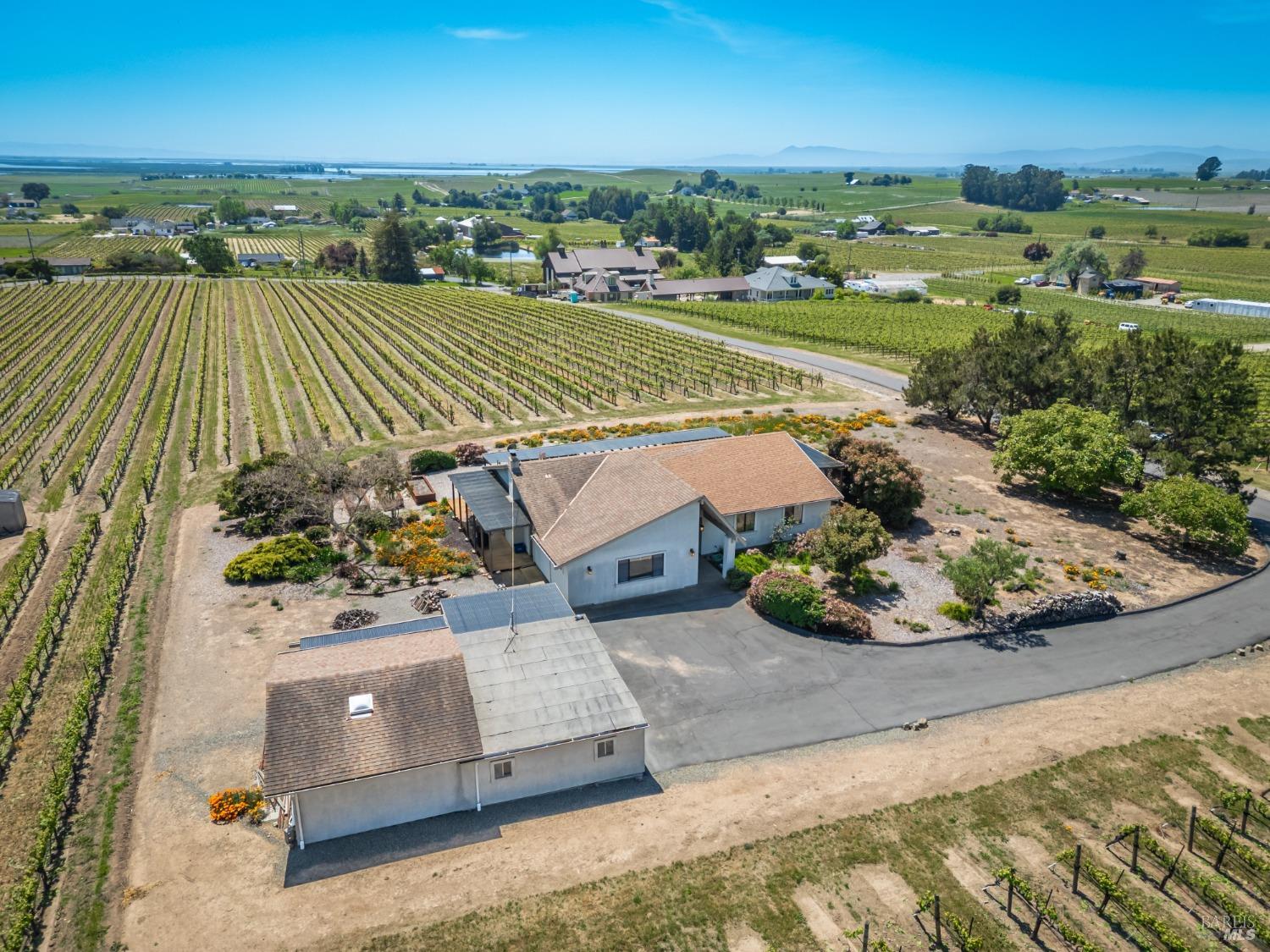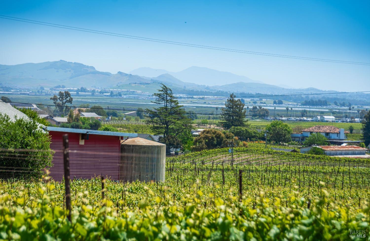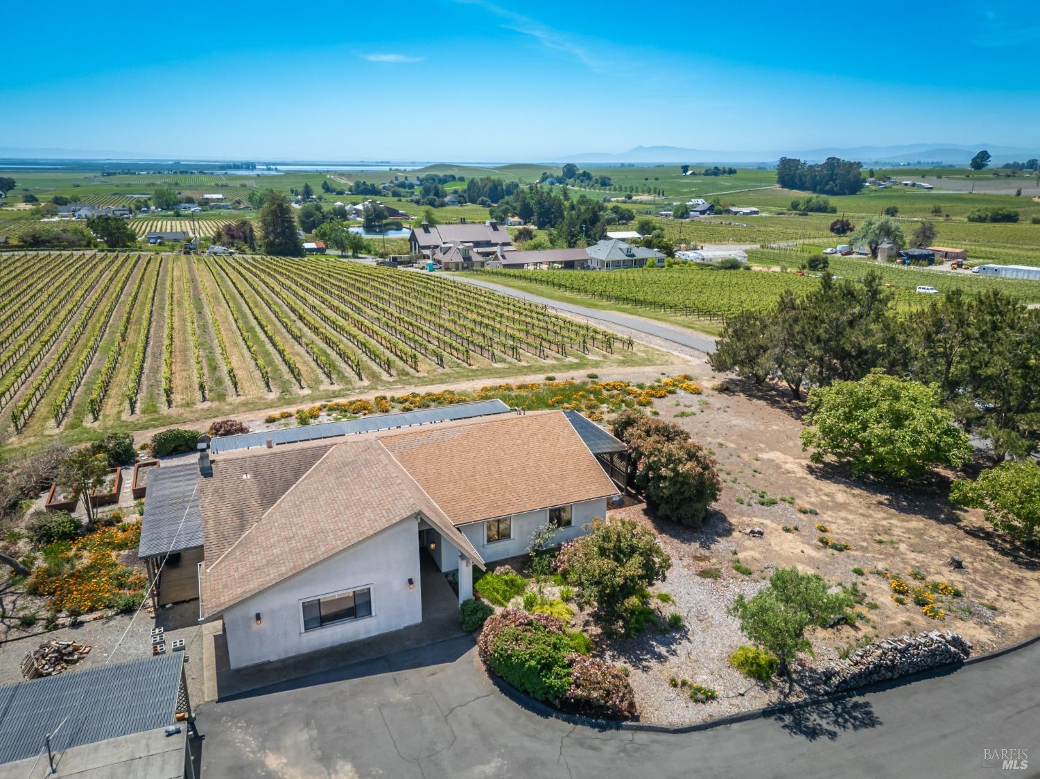 Carneros Vineyard Estate with Iconic Views 3 Bed | 2 Bath | 2,116 SF | 1 LVL |10 Acres | Carneros AVA A rare 10-acre vineyard estate perched on a private knoll in Napa's Carneros region, offering panoramic 360 viewsfrom vineyard-covered valleys to Mt. Tamalpais, Mt. Diablo, & the Bay. 8.5 acres are planted in premium Pinot Noir, currently used in a renowned sparkling wine program. The single-level 3-bedroom home is filled with natural light & framed by windows that capture breathtaking scenery from every room. Enjoy your morning coffee or evening wine from the expansive south-facing deck as hot air balloons drift by & the light dances over the vines. This peaceful & private setting is just minutes from top wineries, the Napa River, fine dining, & Sonoma access. A rare opportunity to combine vineyard investment with unmatched serenity and iconic wine country living. Detached garage, gardens, SF is just under 50 miles away